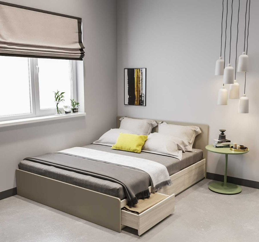 Tận dụng phần không gian rỗng dưới gầm giường, những người thợ của chúng tôi có thể kết hợp khéo léo với 2 ngăn kéo có độ rộng vừa phải vô cùng linh hoạt. Chúng ta có thể tận dụng để chứa quần áo, gối mềm hoặc một vài vật dụng cần thiết khác.